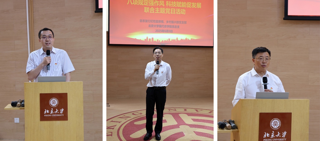 西鹏、熊惊峰、徐一丁先后做总结发言。西鹏表示,本次活动既是一次深刻的党性作风教育课,激励双方党员从北大127年校史中汲取与党的作风建设和中央八项规定精神一脉相承的思想养分,提醒大家不能丢掉艰苦奋斗、为人民服务的优良作风;也是一次理论结合实践的教学课,引导党员同志坚持实事求是的精神,通过深入开展调查研究,找准真问题,真解决问题,将理论研究转化为实际行动,共同为农业农村发展和农业强国建设贡献院企力量。熊惊峰表示,北大发展历史与祖国和民族的命运紧紧联系,北大不仅是北大人的北大,也是中华儿女的北大。双方党员同志应该铭记党的发展历史,团结起来,支农为国,把论文写在祖国大地上,把农业政策性金融活水精准输送到乡村大地上。徐一丁表示,本次活动是对中央八项规定精神的沉浸式学习,形式生动,效果突出,希望通过今天这样的活动,院企之间能够建立起新的协同育人、协同研究的桥梁,以党建融合促产教融合。